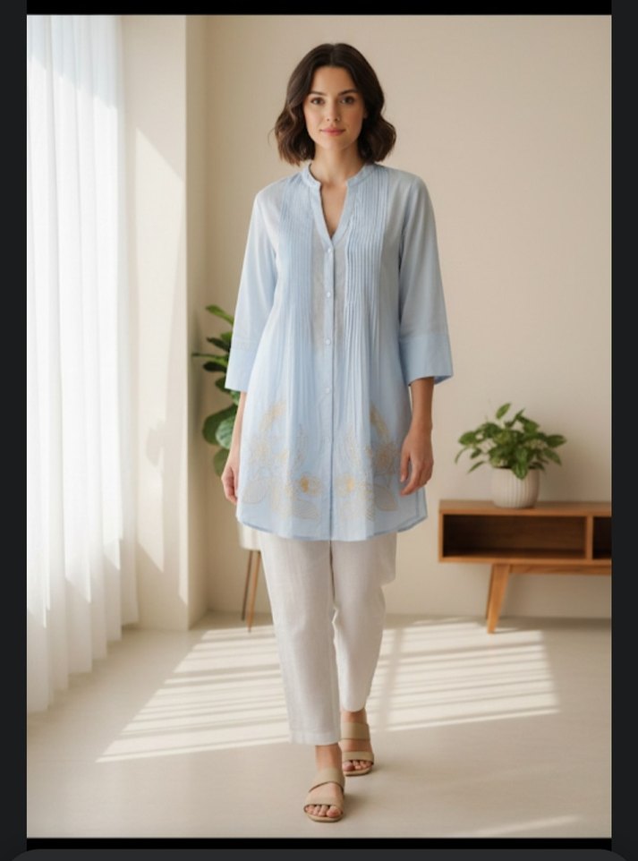 Kadınlar için uzun kollu, V yaka, ön kısmı pliseli keten bluz. Bol kesim ve uzun boyuyla gündelik kullanıma uygun. Altında ince nakışlar bulunur, bohem tarzı yansıtır.