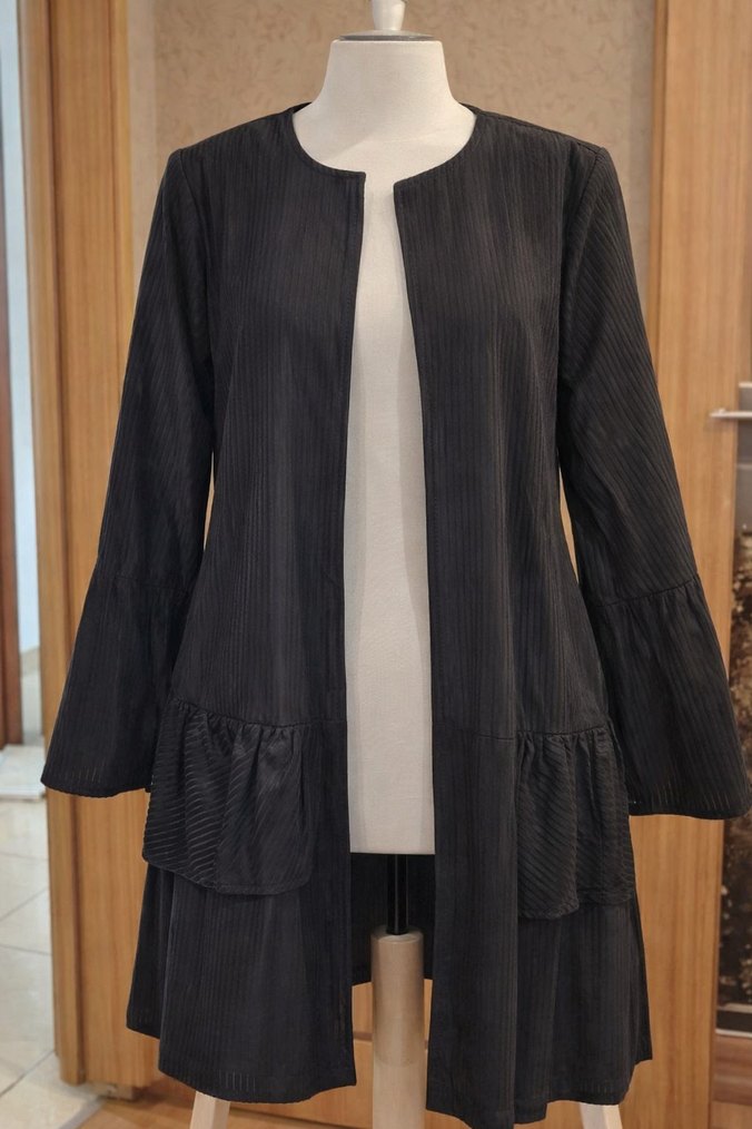 Uzun Kollu Pliseli Siyah Kadın mevsimlik ceket
