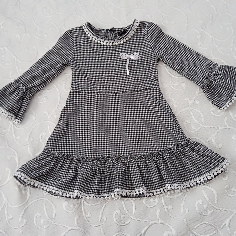 Uzun kollu, yuvarlak yakalı ve siyah pötikare desenli, yumuşak triko kumaştan yapılmış, etek kısmı fırfırlı ve göğsünde küçük fiyonk detaylı, dar kesim kız elbisesi.