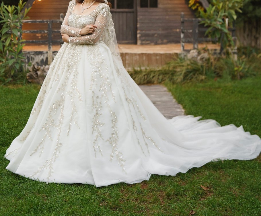 Bu beyaz prenses gelinlik, uzun tüllü kollu Zarif çiçek işlemeleri ve uzun kuyruğu ile göz alıcıdır. 1 kez giyilmiştir düğünden sonra kuru temizleme yapılmıştır herhangi bi sıkıntısı bulunmuyor Gaziantep içi olursa elden teslim olabilir