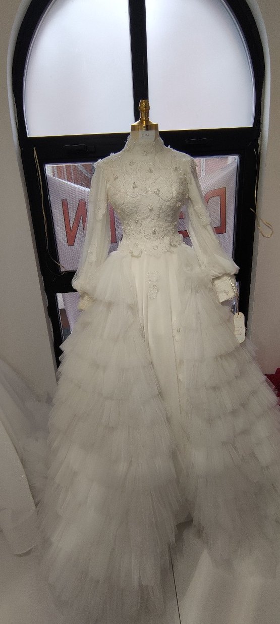 Yüksek yakalı ve dantel detaylı, uzun kollu beyaz gelinlik. Kat kat etek ve klasik vintage tarzıyla zarif bir görünüm sunar. Eteği tak çıkar seçeneklidir. İstenirse kat kat, kuyruklu etek çıkarılıp us kısımdaki çiçeklerden seyrek ve dağıtılmış şekilde işlenmiş eteğiyle A kesim halinde daha sade bir şekilde tercih edilebilir. Arkası korseli bir üründür.