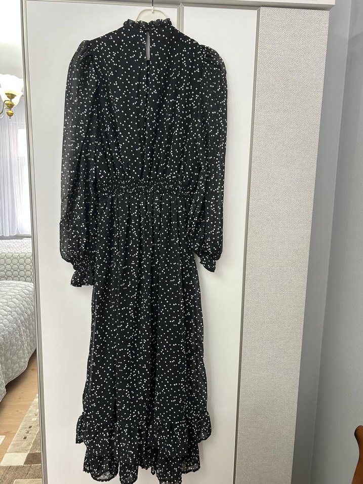 Siyah uzun elbise, yüksek yakalı ve uzun kolludur. Salaş kesim, fırfır detaylı ve puanlı desene sahiptir. Bohem ve retro tarzını yansıtır, günlük kullanım için uygundur. Hiç giyilmedi