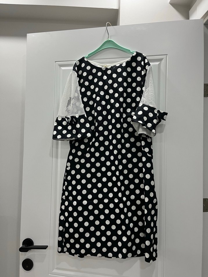 Uzun kollu, düzenli kesim, beyaz zemin üzerine koyu puantiyeli tekstil elbise. Dantel detayları ve bisiklet yaka ile günlük kullanıma uygun, Paris sokak tarzı etkisinde.