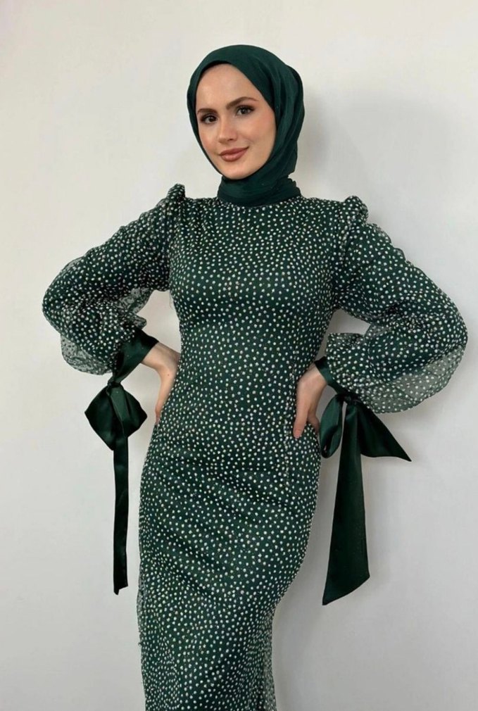 Yüksek yakalı, uzun kollu ve drapeli fiyonk detaylı,puantiyeli koyu yeşil, vücuda oturan simli uzun elbisedir.