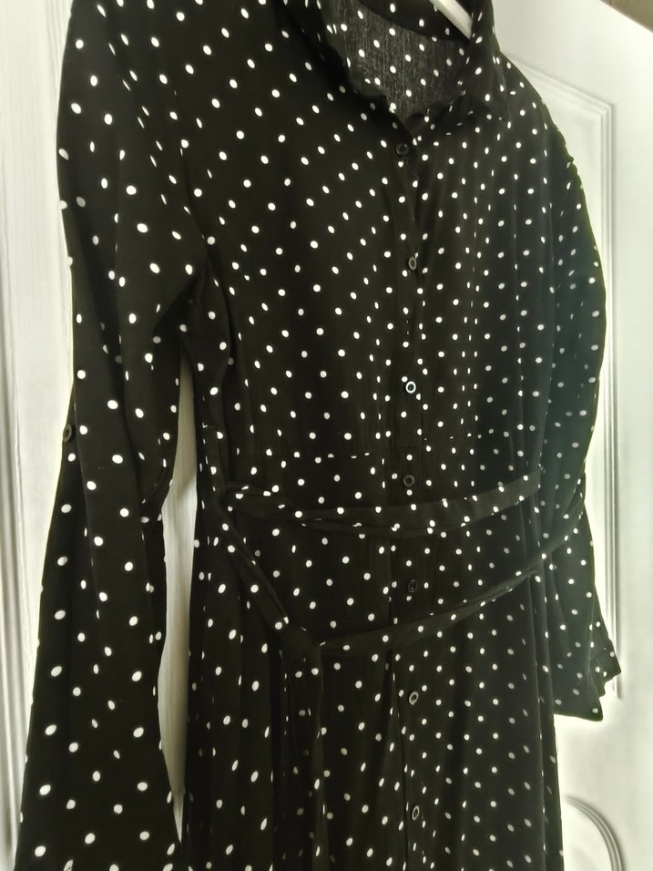 Siyah puantiyeli uzun kollu, çıtçıtlı ve notched lapel yakalıdır. Sentetik kumaştan, bol kesim ve uzun boyludur. Günlük kullanım için uygundur..