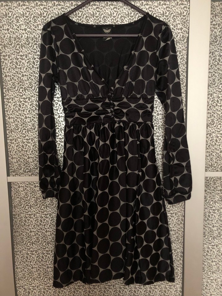 Uzun kollu, düğmeli, V yakalı siyah puantiyeli Midi boyda, ince kumaştan, vintage ve gotik tarzları şıklığıyla buluşturur.