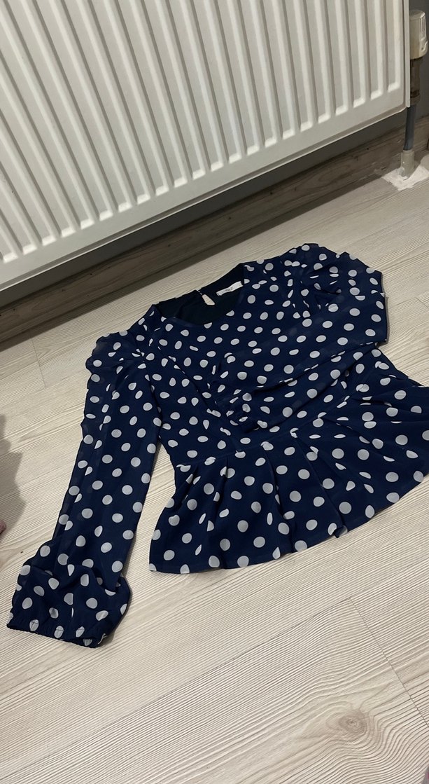 Uzun kollu, yuvarlak yakalı kadın bluz, yumuşak sentetik kumaştan üretilmiştir. Koyu mavi zemin üzerinde beyaz puantiyeler ve fırfır detayları bulunur. Kısa ve bol kesimli, günlük rahat sokak stili için uygundur.
