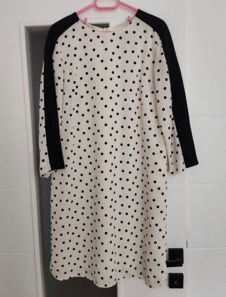 Uzun kollu, yuvarlak yaka, siyah puantiyeli beyaz midi elbise. Bol kesim 38 beden bir elbise. İki kol arası:48 boy:92 cm dir.