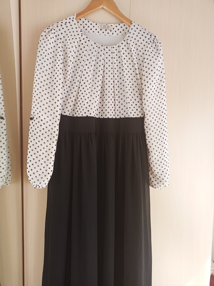 Uzun kollu, yuvarlak yakalı, puantiyeli ve pliseli detaylara sahip, bol kesim uzun elbise. Beyaz üst kısmı puantiyeli, alt kısmı koyu renktir.