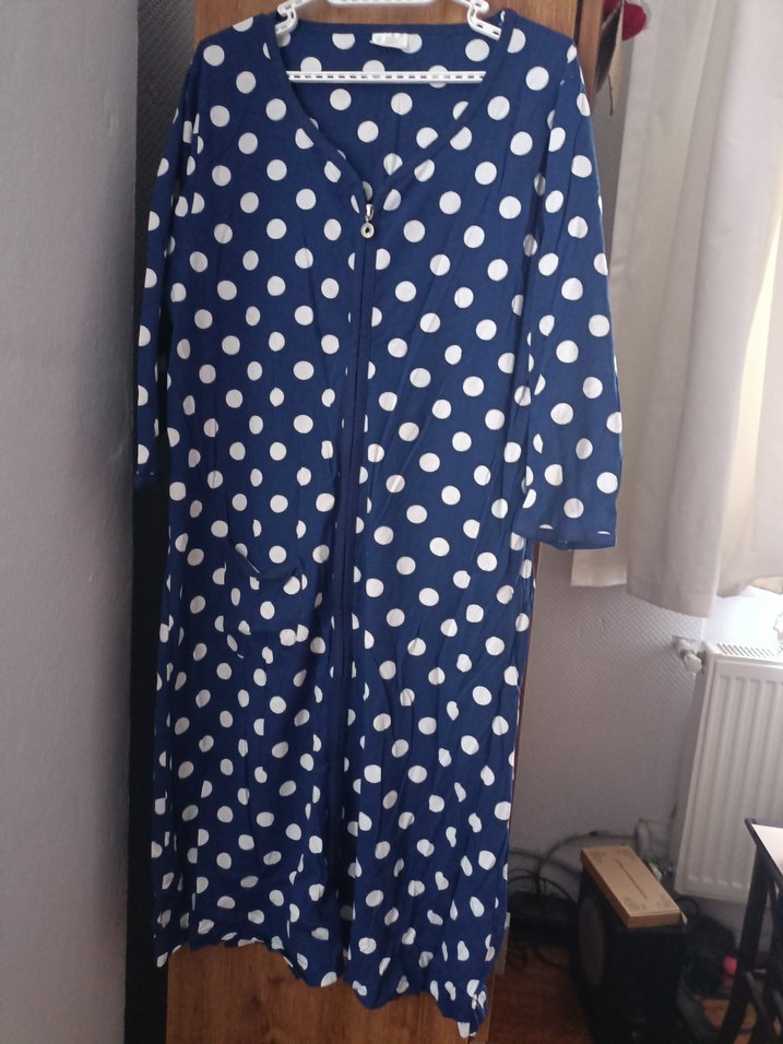 Uzun kollu, bol kesim ve beyaz puantiyeli koyu mavi sabahlık. Notlu yakalı ve uzun boyda rahat kullanım sağlar. boy 103cm. bel 50 cm.x2 hafif likra