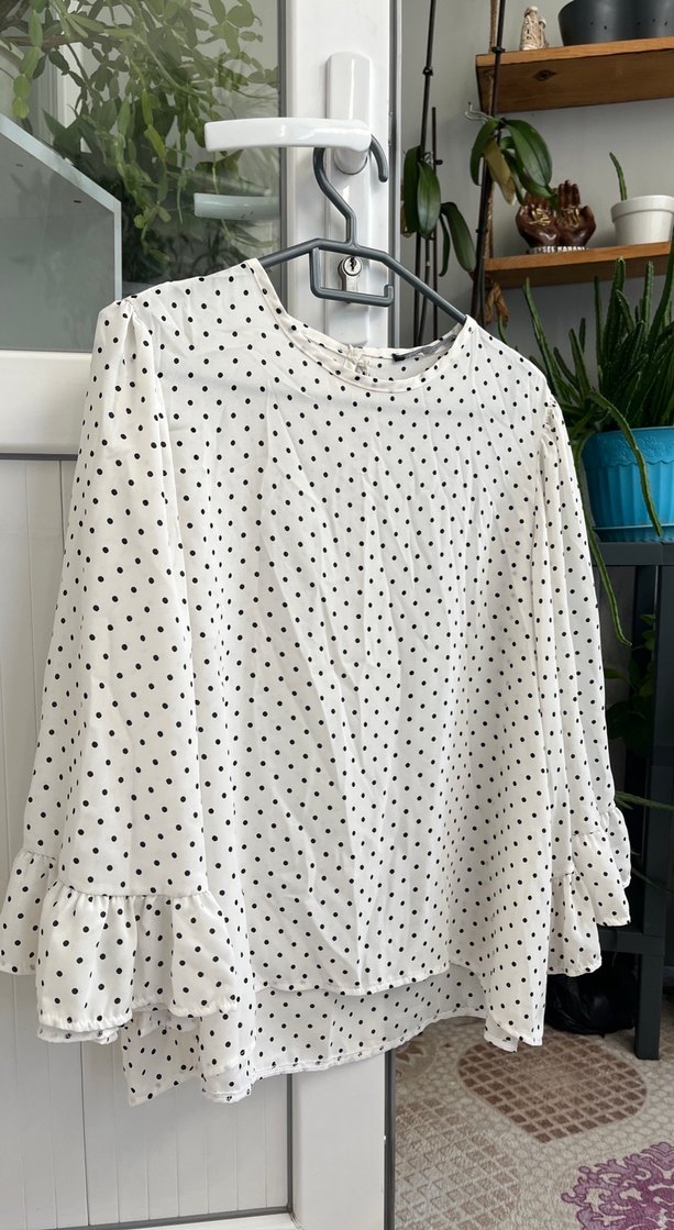 Uzun kollu, yuvarlak yakalı, siyah puantiyeli beyaz sentetik kumaştan yapılmış salaş kesim bluz. Düğmeli detay ve midi boy şıklık katıyor. ✨