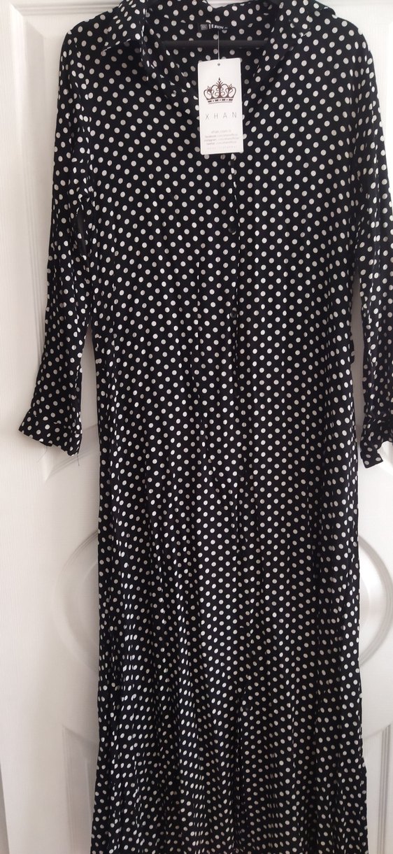 Uzun kollu, V yakalı siyah elbise beyaz puantiyelerle ve pile detaylarıyla bol kesimdir. Yumuşak sentetik kumaştan üretilmiştir, günlük kullanım için uygundur.