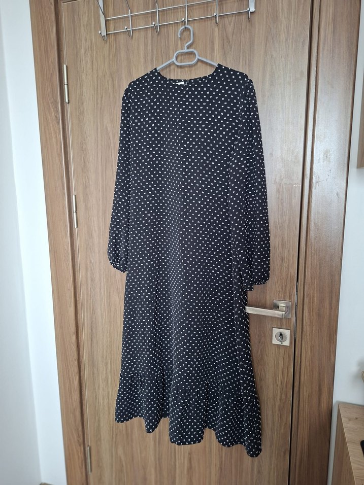 Siyah uzun elbise, bol kesim, uzun kollu ve yuvarlak yakalıdır. Puantiyeli deseni ve etek ucundaki fırfır detayıyla dikkat çeker. Günlük kullanıma uygundur.