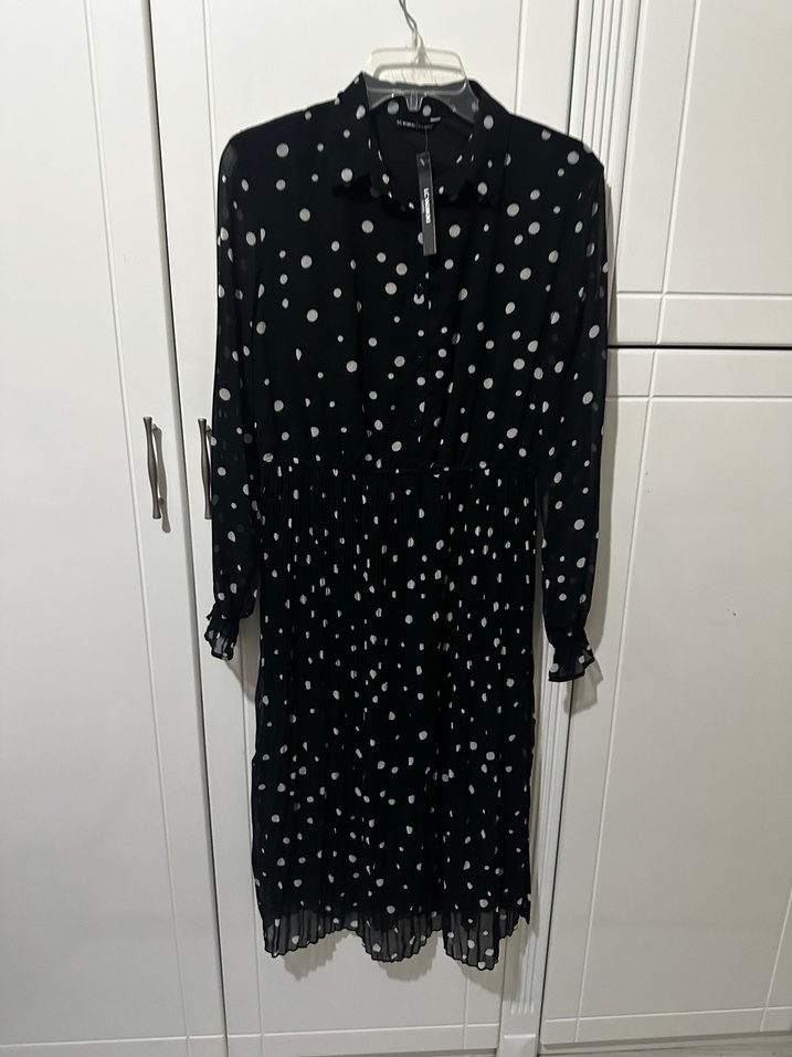 Etiketli, Uzun kollu, siyah zemin üzerinde beyaz puantiyeli, pileli etekli ve polo yakalı rahat kesim şifon elbise. Günlük kullanıma uygun, yumuşak sentetik kumaştan yapılmıştır.