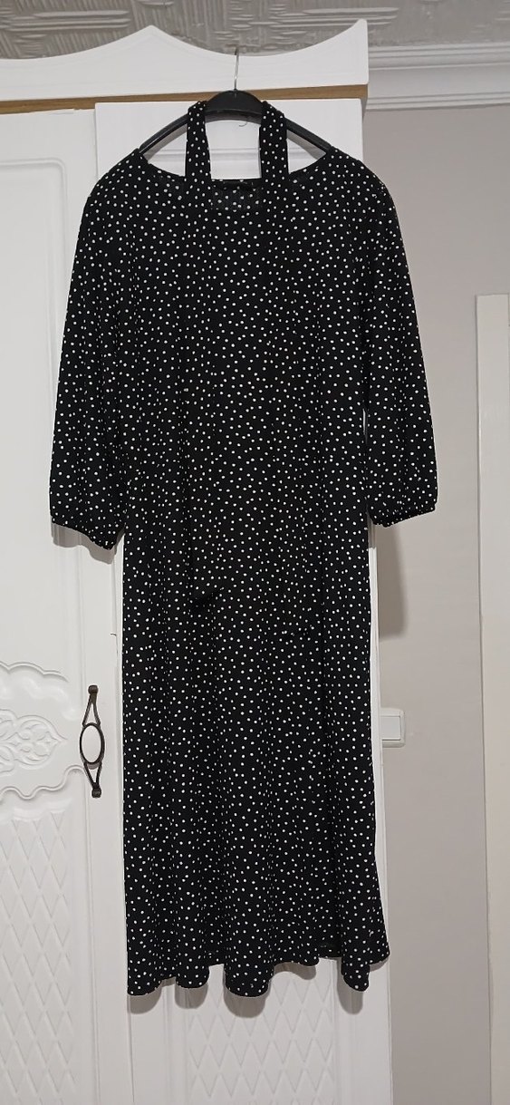 Siyah zemin üzerine beyaz puantiyeli, uzun kollu, V yaka ve düğmeli, bol kesim uzun elbise. Yumuşak sentetik kumaştan üretilmiştir.