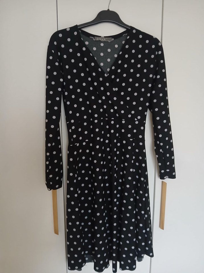 Bu dar kesim midi elbise, uzun kollu, V yakalı ve düğmeli ön detaylıdır. Siyah zemin üzerine beyaz puantiyelidir. Trendy gündelik Goth tarzı için uygundur.