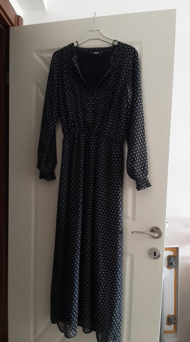 Bol kesim uzun elbise, V yaka ve uzun kollu, sentetik kumaştan yapılmış, pileli tasarım ve koyu renk puantiye deseniyle.