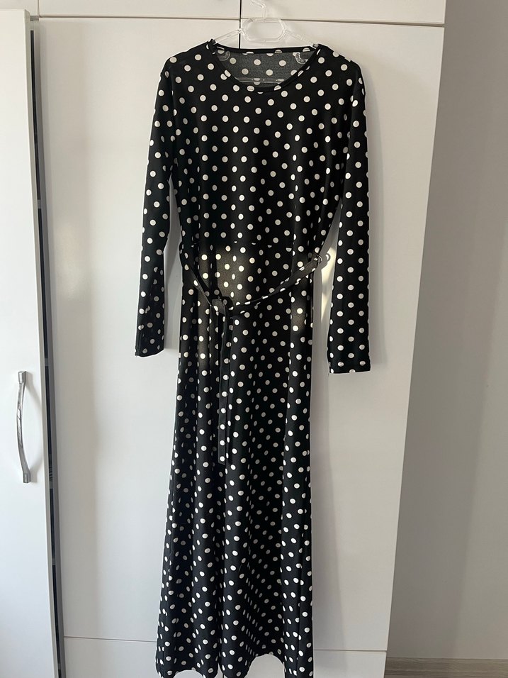 Uzun kollu, tekne yaka ve kemerli bel detayına sahip, siyah zemin üzerine beyaz puantiyeli, vücuda oturan uzun elbise. Yumuşak sentetik kumaştan, bohem ve retro tarzda.