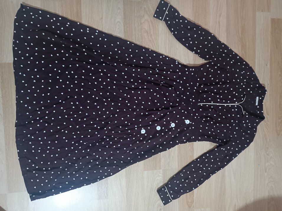 Uzun kollu, V yaka ve düğmeli detaylara sahip bu elbise, kahverengi puantiyeli deseniyle vintage goth ve bohem tarzını yansıtıyor.