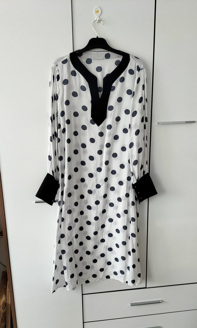 Lacivert puantiyeli beyaz kumaştan, V yaka ve düğmeli manşetlere sahip bol kesim uzun tunik. Günlük kullanıma uygun, bohem tarzda. Bir kez kullanıldı temiz