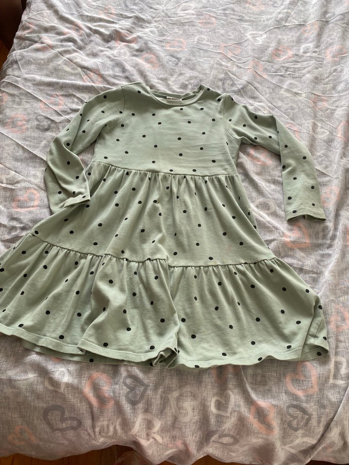 Uzun kollu, yuvarlak yakalı ve fırfırlı bol kesim kız elbisesi. Yumuşak sentetik kumaştan yapılmış, pastel yeşil renkte siyah puantiyelerle bohem ve retro tarzda.