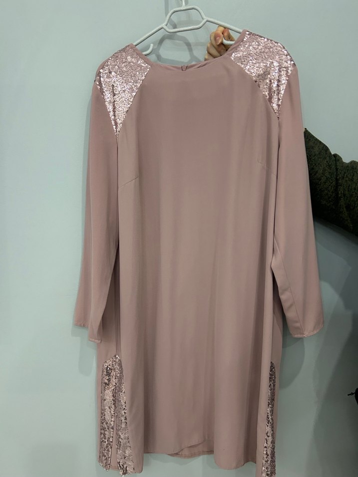 Uzun kollu, bol kesim pudra tonlarında, yumuşak ve parlak detaylı omuz ve yanlarda payet süslemeli saten dokulu kadın takım. Pantolon arka kısmı lastikli olup rahattır.Alvina marka olup 46 bedendir.Sıfır ayarındadır.Sadece düğünde bir kaç saat giyildi.✨
