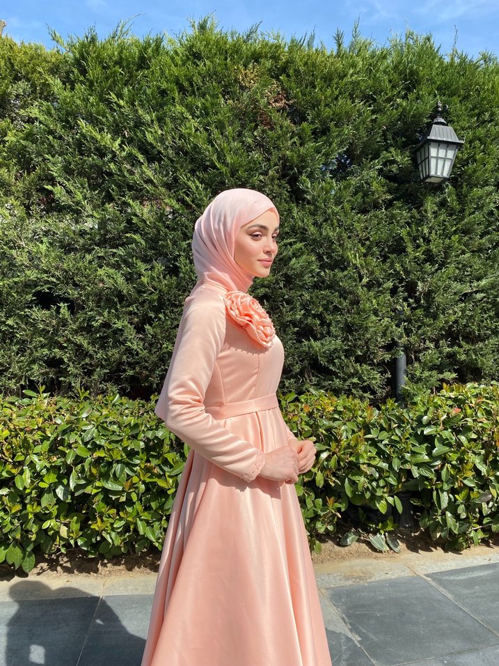 Drapeli , pudra pembesi uzun kollu tesettür abiye. Yüksek yakalı, uzun boylu ve düğünler için uygun, rahat kesim. 34-36 beden uyumlu