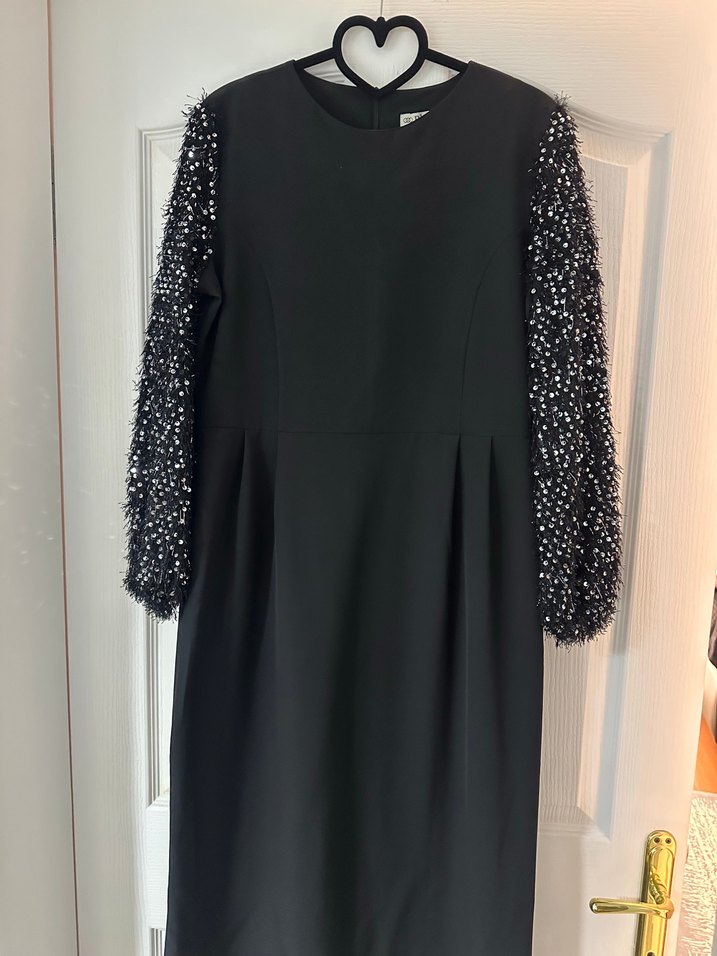Uzun Kollu Pul İşlemeli Siyah Elbise