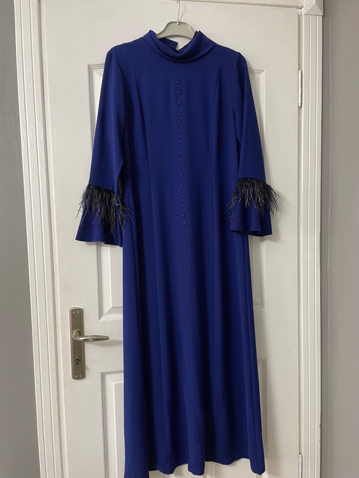 Uzun, koyu lacivert renkte, yüksek yakalı ve püskül detaylı uzun kollu bir kadın elbisesidir. Ofis için uygun, mütevazı ve regular fit kesime sahiptir.
