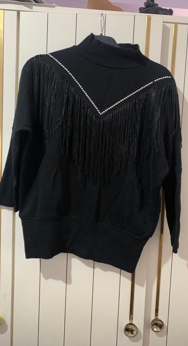 Siyah uzun kollu, yüksek yakalı ve bol kesim sweatshirt, gotik tarzda işlenmiş püsküllerle süslenmiştir.