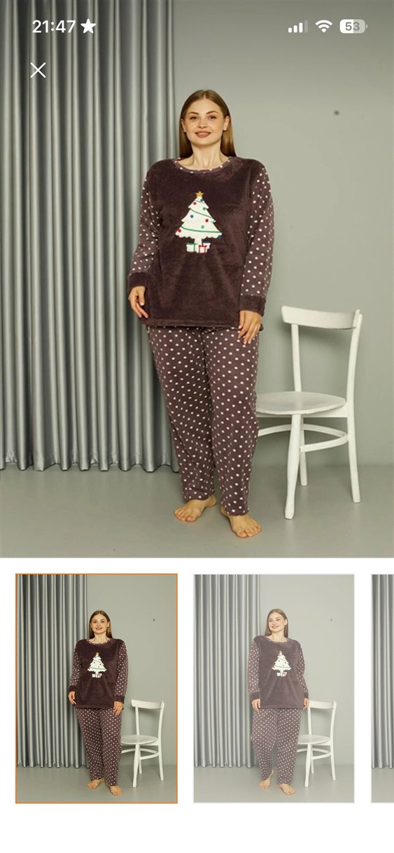 uzun kollu ve bol kesim pijama takımı. Üstte yılbaşı ağacı desenli, kollar ve pantolonda puantiyeli desen bulunur. Yumuşak ve rahat kumaşlıdır.