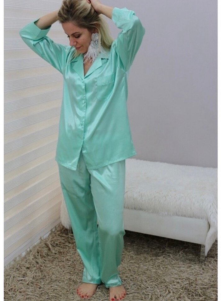 Uzun kollu, yeşil renkli, desen içermeyen, rahat kesim kadın pijama takımıdır.