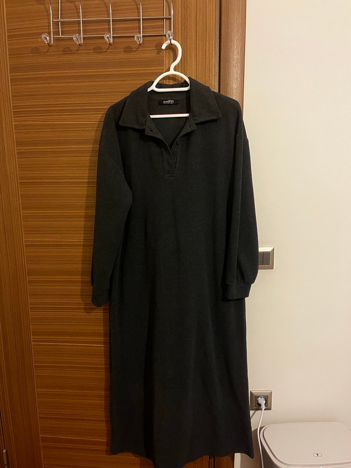 uzun kollu, rahat kesim ve düğmeli detaylara sahip uzun elbise. Yumuşak ve sıcak kumaştan, minimal tarzda gündelik kullanıma uygun. Antrasit rengi sorunsuz yeni gibi