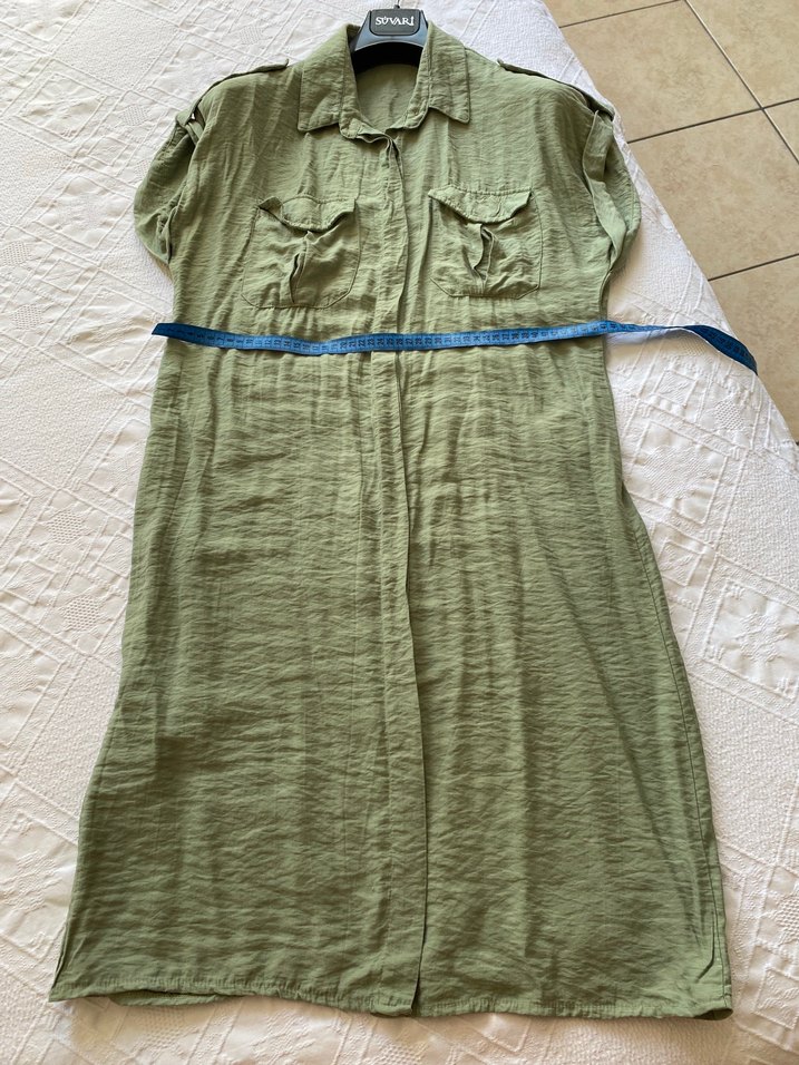 Haki renkte, kısa kollu ve yakası kesik detaylı, bol kesim gömlek elbise Önünde iki cep bulunur. Yumuşak ve hafif kumaştan üretilmiştir.