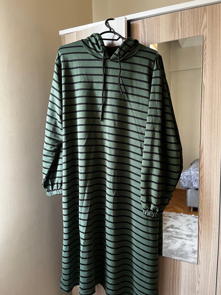 Uzun kollu, bol kesim hamile tunik, yüksek yakalı ve drapeli kapüşonlu. Yeşil ve gri çizgili desende, yumuşak sentetik kumaştan, günlük rahat kullanım için uygun.