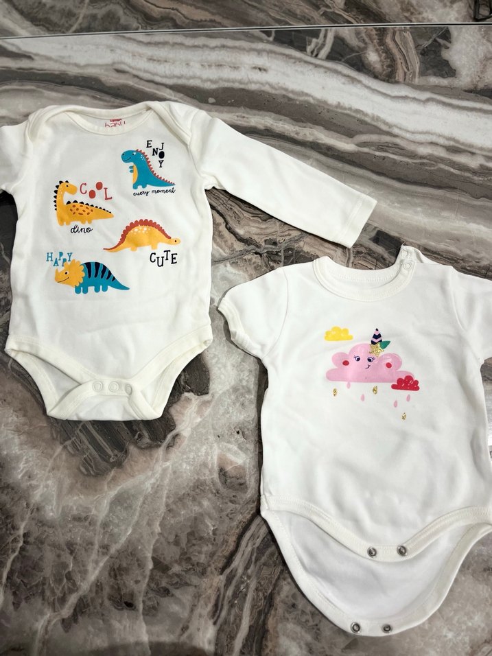 Pamuklu, uzun kollu, yuvarlak yaka bebek body. Beyaz zemin üzerine renkli dinozor baskıları ve "CuTE" yazısı bulunur. Streetwear tarzında.