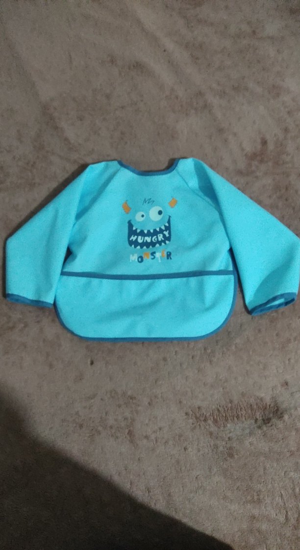 Mavi renkte uzun kollu, renkli baskılı 'My Hungry Monster' yazılı bebek önlüğü, döküntüleri yakalamak için cep içerir. ebebek