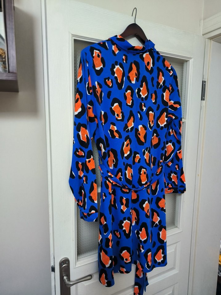 Rahat kesim, uzun boy kadın gömlek mavi zemin üzerie karışık renkli gömlek elbise. Uzun kolludur