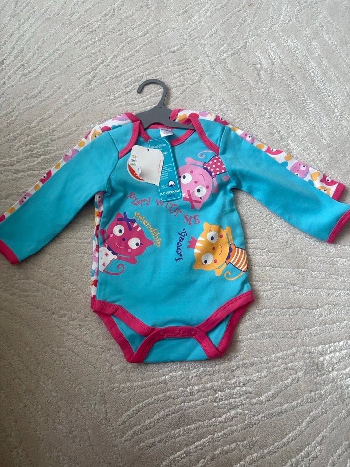Uzun kollu, yuvarlak yakalı, renkli baskılı ve örme kumaştan yapılmış mavi bebek body.
