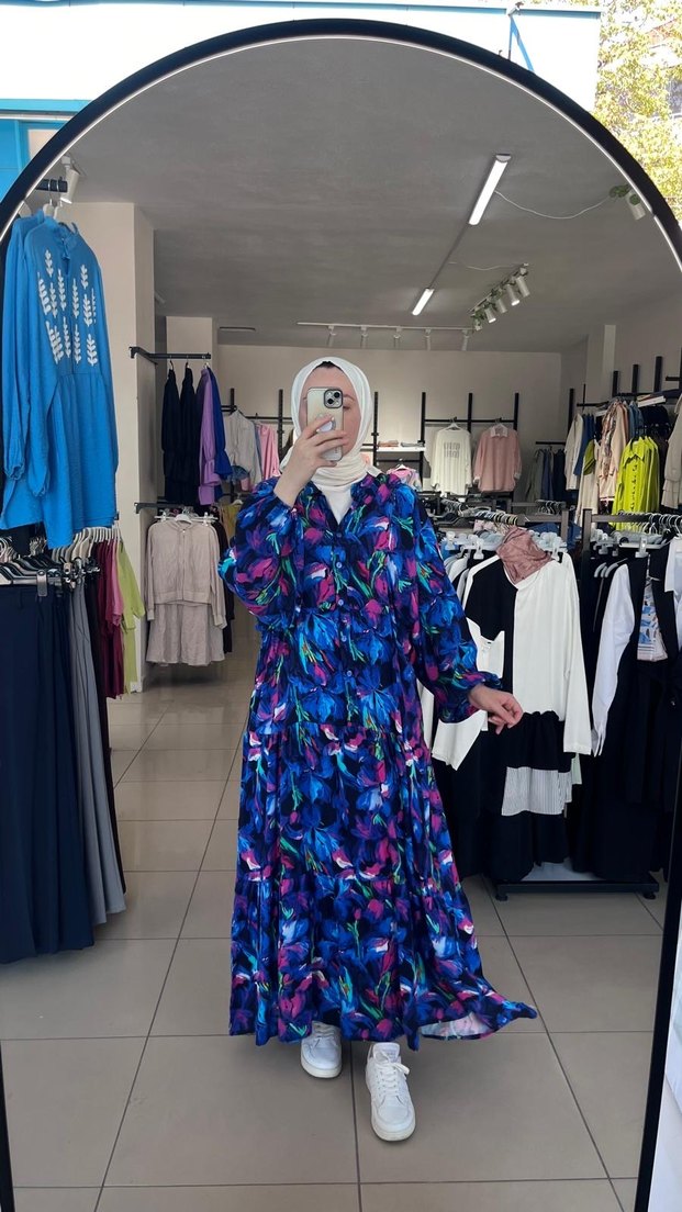 Uzun, bol kesim elbise, koyu renkli çok renkli batik desenli ve dökümlü sentetik kumaştan yapılmıştır. Uzun kollu ve yüksek yakalı, günlük kullanıma uygun tesettür tarzında. 1 adet S-m kol 68 cm göğüs 112 cm boy 132-133 cm