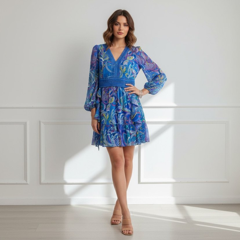 Uzun kollu, renkli tie-dye desenli bohem elbise. V yaka ve fırfır detaylı, bol kesim ve yumuşak sentetik kumaştan yapılmıştır.