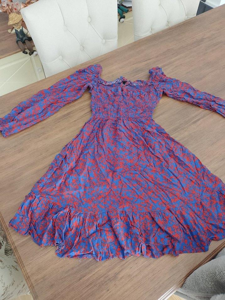 Renkli tie-dye desenli, bol kesim uzun elbise. Uzun kollu ve tekne yaka, bol kumaştan yapılmıştır. Dış mekan kullanımı için uygundur.