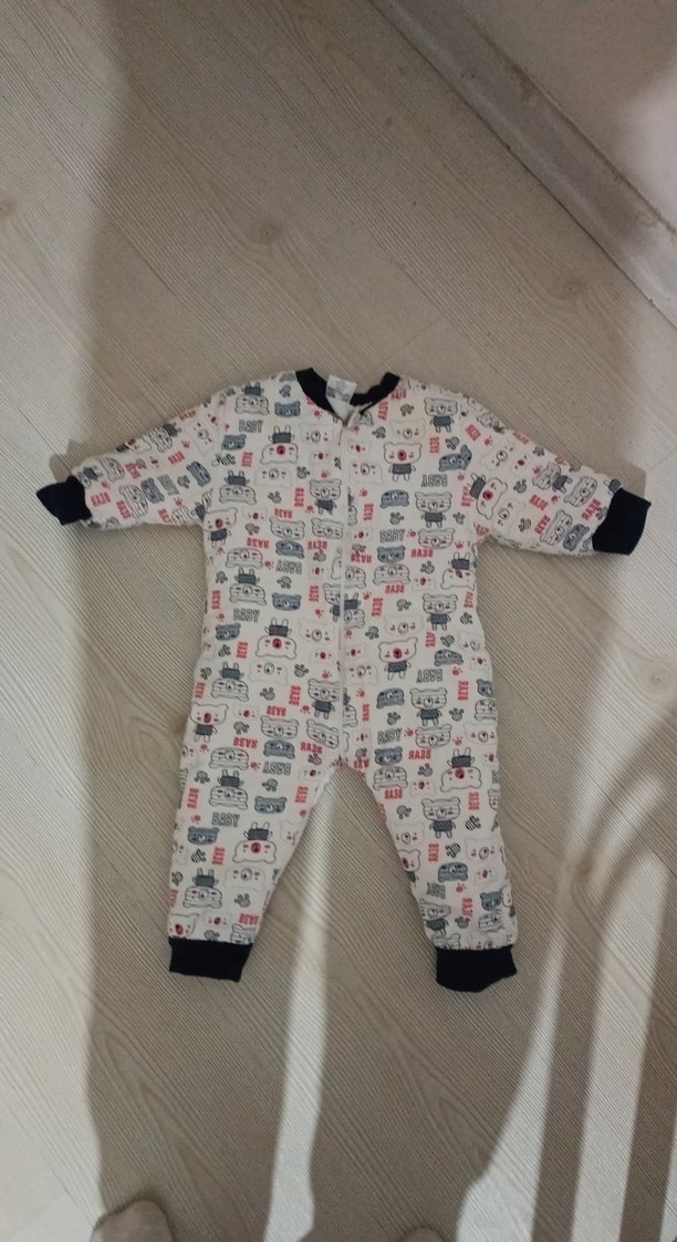 Uzun kollu ve bisiklet yakalı, yumuşak ve sıcak örme kumaştan erkek bebek tulumu. Beyaz zemin üzerine renkli desenler bulunur.içine sadece zıbın giyilip kullanılmalı yorgan gibi çünkü tulum ben çok rahat ettim bebeğimde rahat uyudu çok kullanamadım bulunduğum şehir ılıman iklimi var alana hayırlı olsun