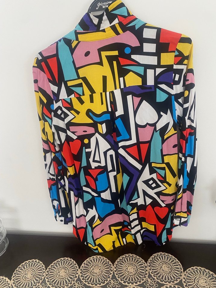 Renkli pop kültür desenli, uzun kollu ve V yakalı bol kesim kadın gömleği. Sentetik kumaştan, fermuarlı detaylı, parti için uygun.