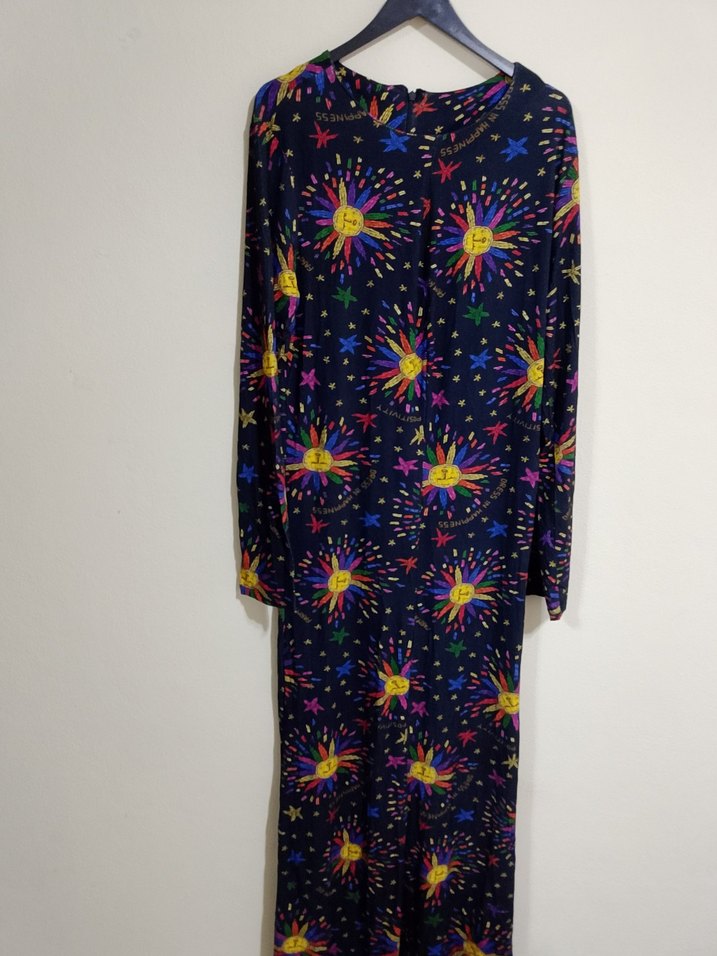 Uzun kollu, bol kesim kadın elbisesi, canlı tie-dye desenli Yuvarlak yakalı ve sentetik kumaştan yapılmıştır.