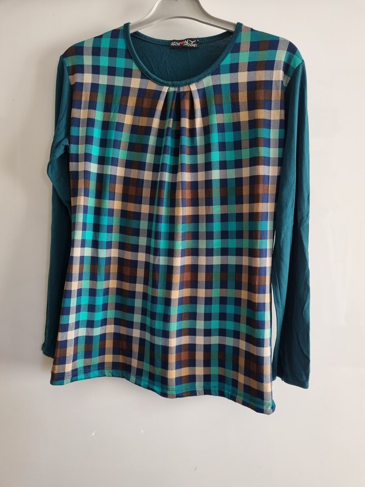 Kadınlar için uzun kollu, yuvarlak yakalı ve salaş kesim bluz. Renkli kareli desen ve yakada pile detayları bulunur. Yumuşak sentetik kumaştan, günlük kullanıma uygun.