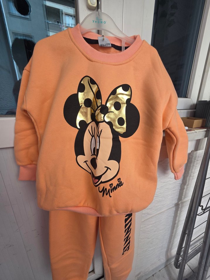 Uzun kollu, renkli baskılı Minnie Mouse deseni olan kız bebek takımı. Yumuşak kumaş ve kolay giydirme için cırt cırtlı kapanış içerir. Kahverengi ve pembe tonlarında. şardonludur, kesınlıkle kaçırmayın derımmm