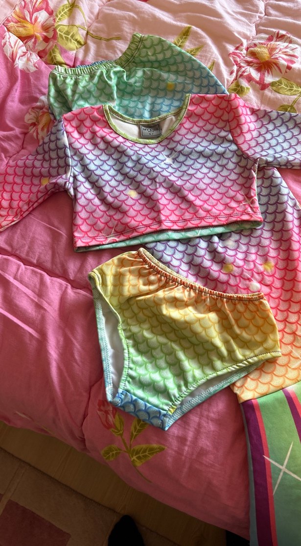 Uzun kollu, pullu desenli renkli tie-dye kız bikini. Üstü kısa kesim, altı uyumlu renklidir. Parti için uygun.