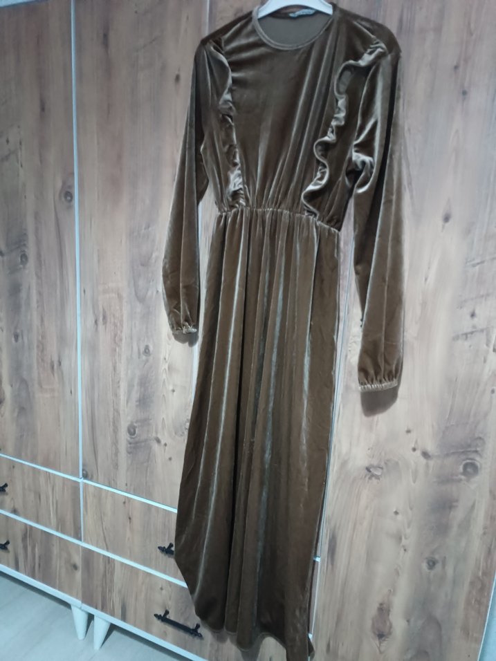 Bej-gri tonlarında, yumuşak sentetik kumaştan, uzun kollu, salaş ve drapeli uzun elbise. Günlük kullanıma uygun, bohem ve rahat bir tarz sunar.