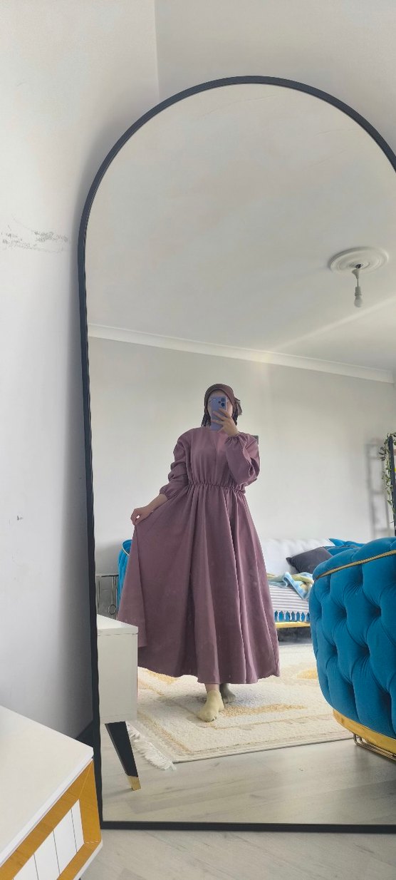 Pastel , yüksek yakalı ve uzun kollu, salaş kesimli ve pirenses model uzun elbise. Yumuşak sentetik kumaştan, minimalist tarzda günlük kullanıma uygun.